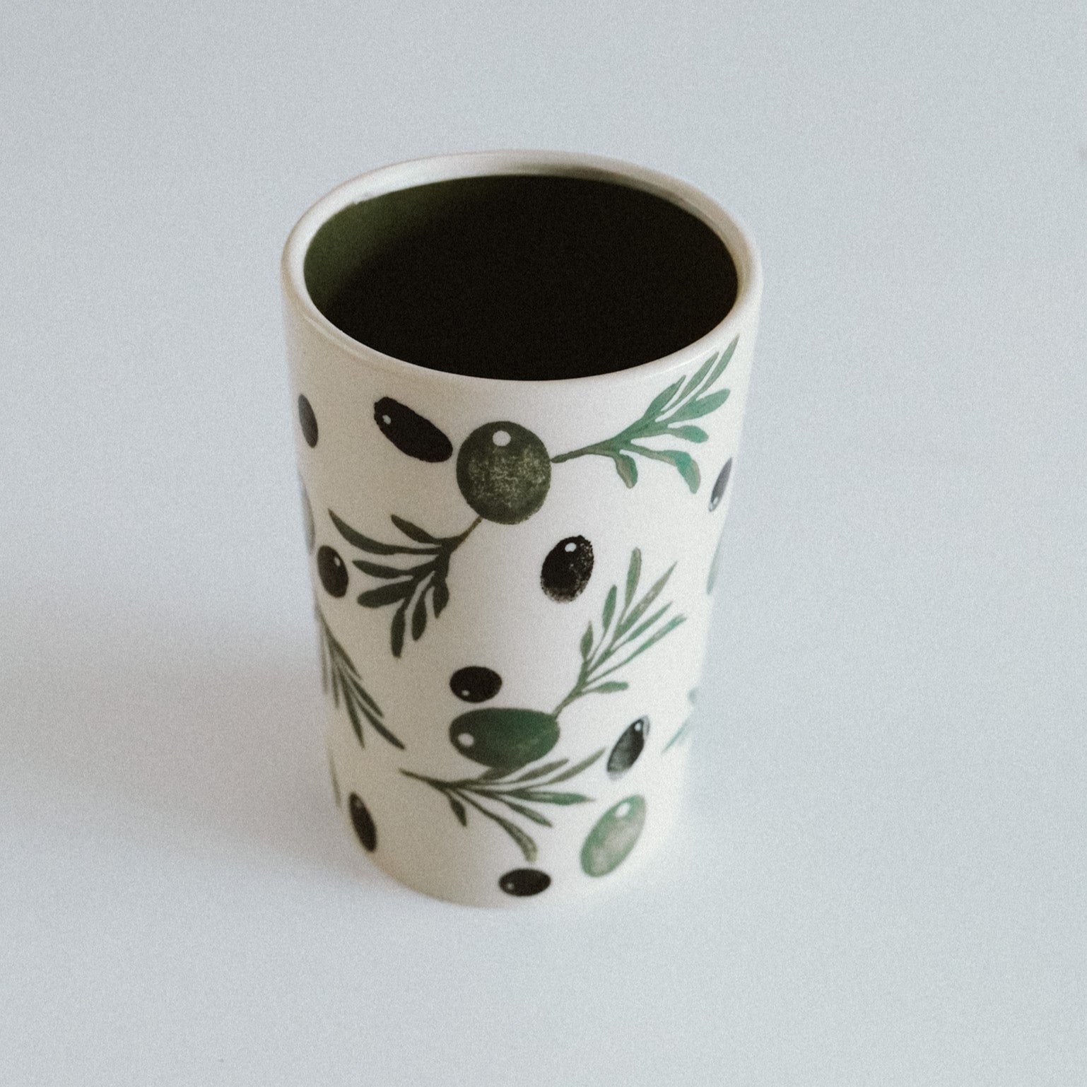 Inspired by Mediterranean charm, this handmade ceramic cup features hand-painted olives and sprigs of rosemary in earthy greens and deep blacks. With its soft matte finish on the exterior and a glossy olive green interior, this cup brings a fresh, rustic elegance to your everyday rituals.