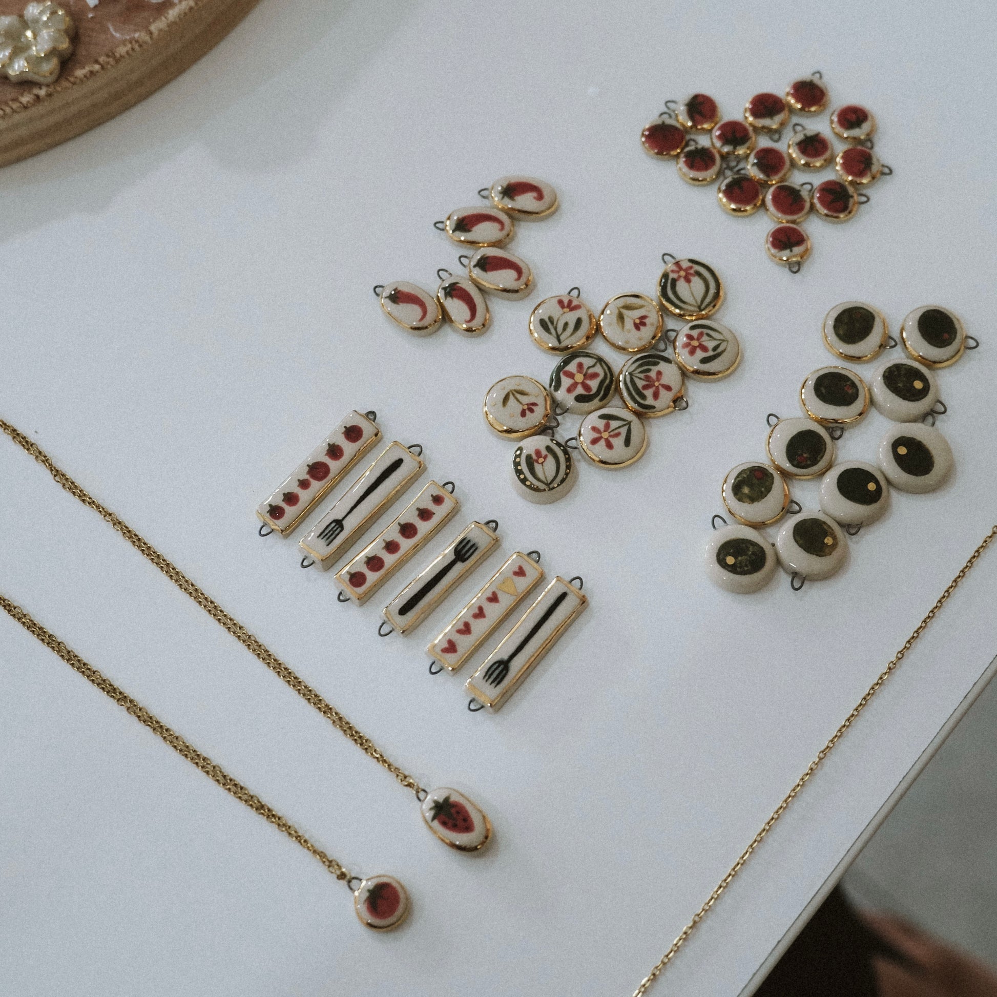 Each pendant is hand-shaped in ceramic and finished with a glossy gold rim, featuring delicate hand-painted motifs — from tiny strawberries and tomatoes to little florals.